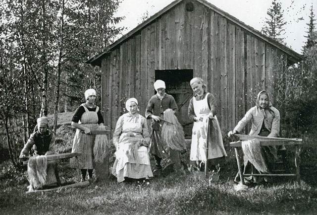 The below picture shows the scutching of flax, at a nearby farm. Karin Olsson, born 1887, is the woman sitting down on the left, and she lived in Kullfallet at the time (photographer unknown).