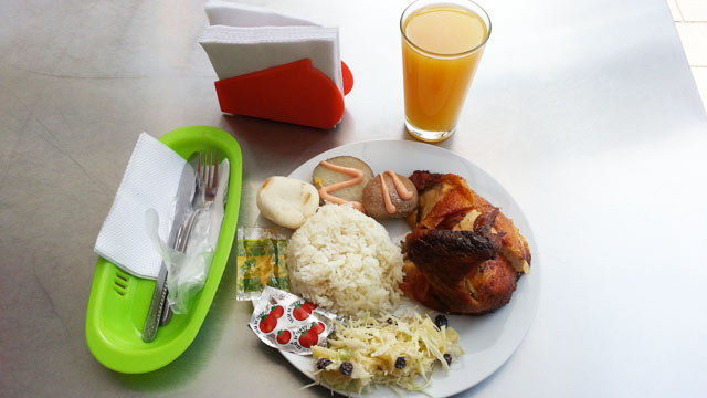 Below: A typical Colombian meal. Grilled chicken, potatoes, rice, arepa, coleslaw salad and fruit juice. Served with ketchup and honey. $3.50.