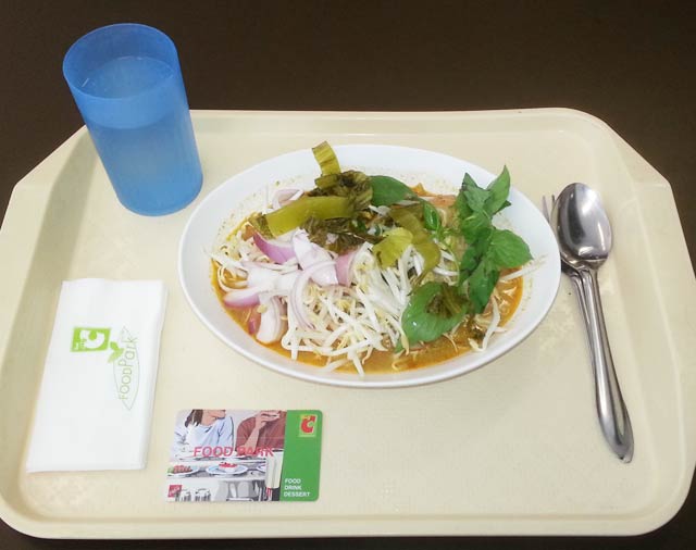 Below: Khao Soi curry soup with noodles, chicken, bean sprouts, onions, fermented vegetables and herbs, at a shopping mall in Chiang Mai. $1.35.