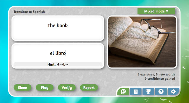 The app also gives hints in different ways. If you have never typed the word before, the app tells you what to type (the Spanish translation), and you repeat that three times to reinforce it. The next time you practice it, the app hints with a few letters of the word. This is also what happens if you type wrong. Then you continue typing and guessing, and the app gives you more and more of the letters.