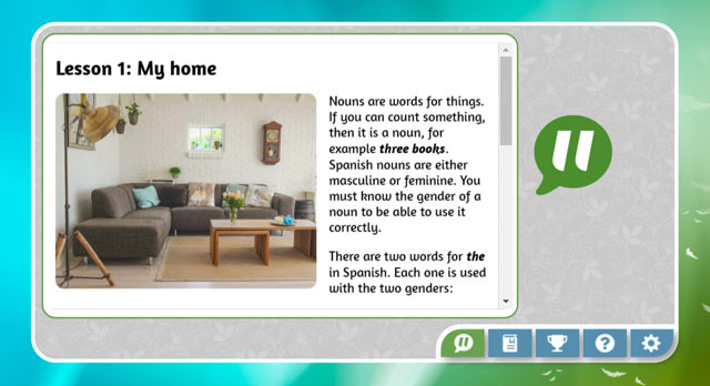 You start the course by reading the first lesson, which for this course explains Spanish nouns and noun genders, including a few example words. Then you practice word by word, as if you are using flashcards. You look at the English word and type in the Spanish translation. You hit enter, and the app checks if you typed right. If correct, a voice says the word out loud and you repeat it out loud. Then on to the next word.