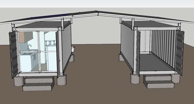 To get more storage space for tools, and a shaded area to relax or work, an additional container can be used. The roof is extended to cover the entire area.