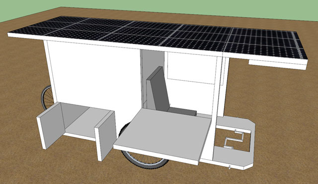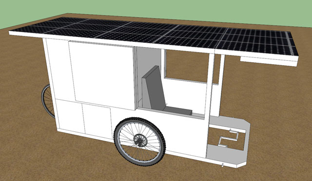 Taking real life experience into account, I know it is hard to average more than 20 km/h on a bicycle for an extended period of time, so I predict that this bike with its much heavier weight will have a normal cruising speed of 6 km/h, which is normal walking speed, and that it will be able to ascend slopes of at max 15% grade. Most of the time it will be a combination of muscle power aided by hub wheel motors, but at times solar power will be enough in itself.
