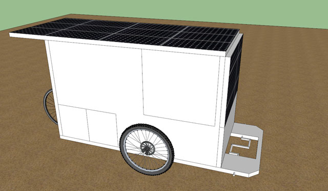 The main purpose of the solar panels is to power the hub motors while riding, but they also charge a Li-Ion battery, so electrical devices can be used in the evening. Batteries are heavy and expensive, so this battery is only large enough to power simple devices, and can't run the hub motors.