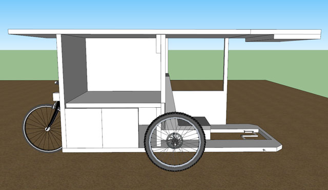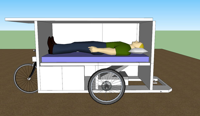 To prepare for sleeping, the bike is reconfigured as shown above, and the side panels are locked from inside. You enter the bed through the front, and then pull the front panel towards you and lock it into place.