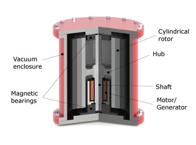 A balanced heavy wheel spins at high speed on high quality bearings. On the fly-wheel is an electrical motor, that can also act as a generator.