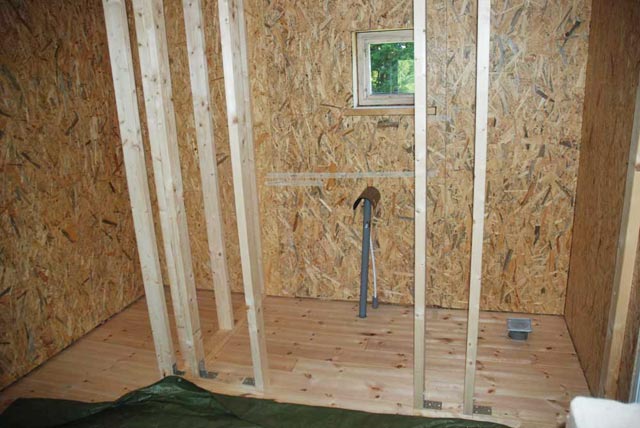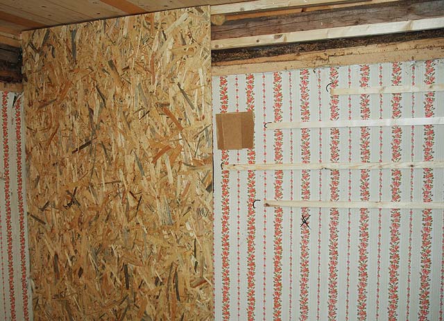 Next I put up the OSB wall boards. It was a bit tricky because the walls are far from straight in an old log house. So a lot of small wood and hardboard pieces were nailed before the boards could be mounted.