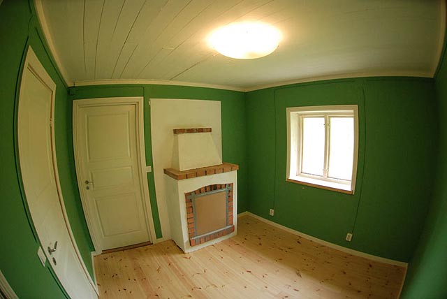 Then I covered all board joints with fiberglass tape, and spread out putty on the walls to make them really smooth. I had hoped that the putty would hide the OSB fiber texture, but after painting the walls, it was still visible. To keep things simple I installed electrical cords on the walls, instead of using conduit inside the walls, as is normally done. I picked a bold green color for the walls, because I felt bored with all the bright shades that I've used in the past. This made a more retro feel. Finally, I mounted the decorative white strips. Next step is to repeat all this for the kitchen/living room.