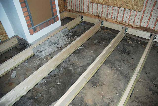 I mounted a frame of beams to the old sills, and then 145x45 mm (6x2") joists (reglar) with joist hangers (balkskor), 60 cm apart, which is standard here in Sweden. Duckboard (trall) is screwed to the underside of each joist, to support the sub-floor boards.