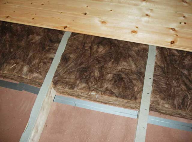 Putting in the sub-floor was a simple matter of dropping in ready-made boards (trossbottenskivor) between the joists (in red color below). Then a layer of 145 mm mineral wool insulation, and 27 mm thick spruce floor boards.