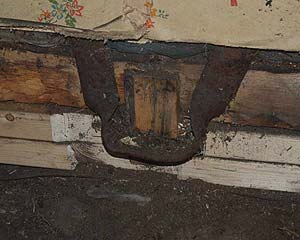This 100 year old floor was built just like a modern floor, although with outdated materials; parallel joists to support the load, mounted 80 cm apart, and secured to the sills with joist hangers (see picture to the right). A sub-floor of thin planks were nailed to the joists, to support the charcoal insulation poured in between the joists. Then the floor boards nailed straight to the joists, to cover it all up.