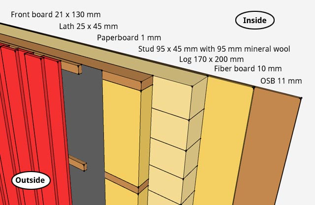 The below drawing shows the design of the walls. The front boards follow the "one under/one over" design that is very common in Sweden. This makes them look nice, and also allows water on the inside to drain out well. The lath strips separates the front boards from the paperboard. The paperboard prevents winds to disturb the mineral wool insulation, making it more effective. The studs keep the insulation in place, and are mounted at a standard 600 mm apart. The logs and fiber board are original materials from a long time ago, and the OSB gives the interior walls a nice smooth surface.