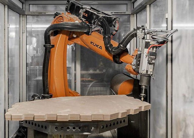 - Robotic milling. The robot at each station receives CNC instructions for the next upcoming particle board. It places the board in its jig, and starts milling. The resulting pieces are labelled and placed on the parts belt.