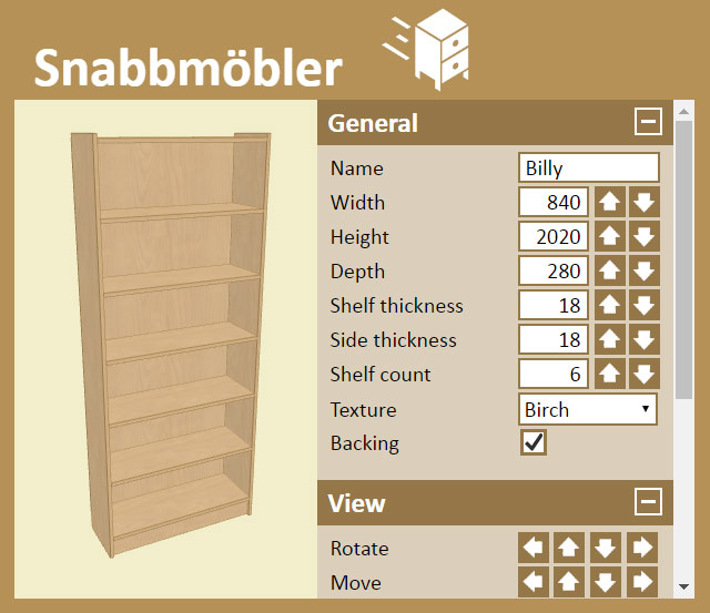 You click the arrows on the right, or type in new values to change the dimensions. You can also change the texture, and decide whether you want backing on the bookshelf. You use the mouse cursor to spin the item around so you can see it from every angle. A print button renders a high quality printout with basic data about the bookshelf.