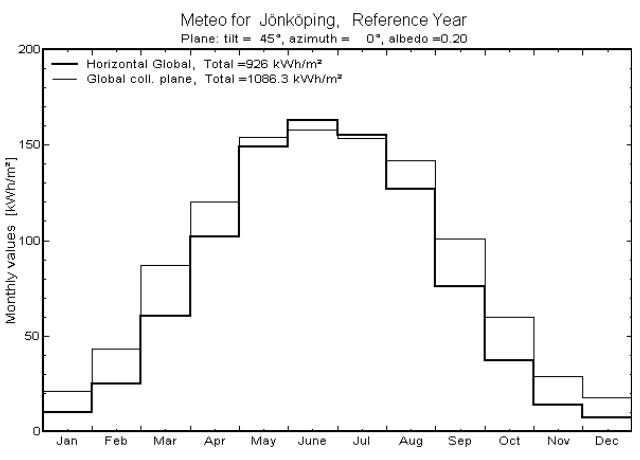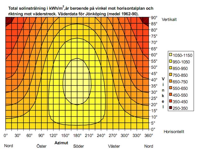 As the sun travels across the sky, the panel should optimally be continuously tilted by motors to directly face it. This produces around 30% more energy compared to a fixed mount, but adds complexity and installation cost. In Sweden, solar panels are normally mounted at a fixed 45 degree angle, facing straight south. The below diagram shows the total sun irradiation in kWh/m2 for a fixed mount panel at different angles.