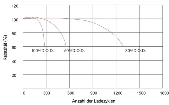 The maximum number of discharge cycles is a figure that states the life span of a battery. It is typically measured at 50% DOD (depth of discharge), which means that the battery is discharged to half of its capacity, then charged up again, and the cycle is repeated until the battery has degraded enough to be discarded. A typical deep-cycle battery can sustain 500 cycles at 50% DOD.
