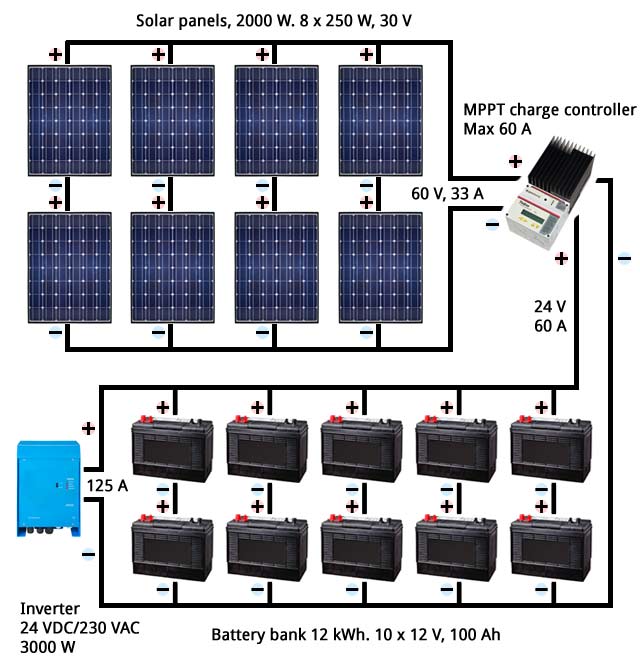 The solar panels and batteries need to be connected in a certain optimum configuration, to make the cost of wiring the lowest, and system performance the best. The aim is to lower the current in the wires as much as possible, while at the same time finding equipment that can handle the resulting high voltage levels.