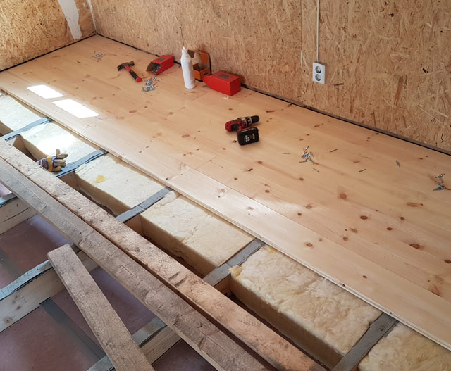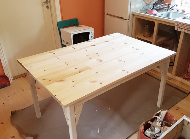 The kitchen floor got replaced. These were built just like in the bedroom, using 145x45 mm (6" x 2") joists, mineral wool insulation and spruce floor boards. I screwed OSB boards to the walls. I then applied putty to the walls with a paint roller to give them a rough finish, and two layers of orange paint.