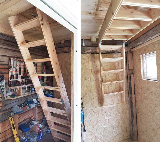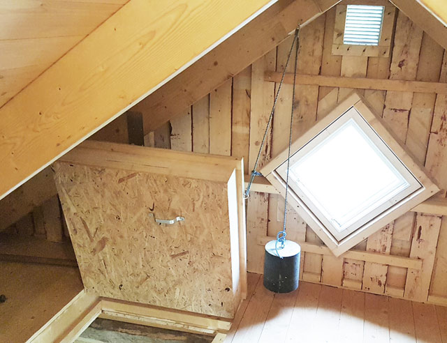I built a foldable ladder to reach the attic. To prevent cold air to come down from the attic, I built a mineral wool insulated hatch, with a counter-weight raising mechanism.