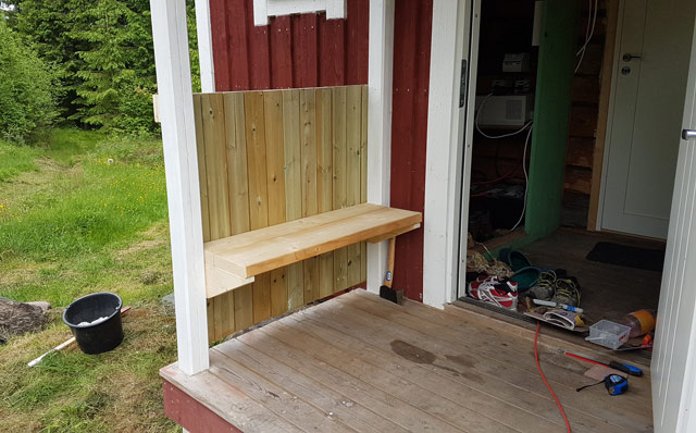 I put up wind and snow protection from decking board on each side of the entrance, and then built a bench, which I enjoyed sitting on in late summer evenings.