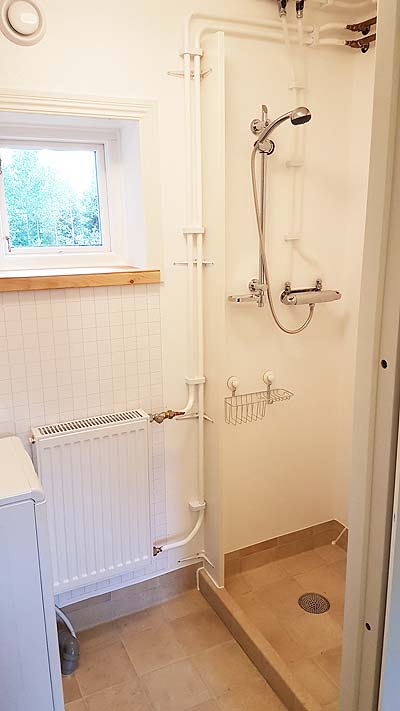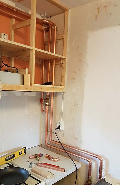 A lot of copper pipe got installed this summer, in preparation to use the second hand Wamsler boiler I bought earlier. I used 28 mm pipes in the main loop between the boiler and heating tank, 22 mm pipes for the radiator stems, and 15 mm prisol pipe from the stems to the radiators.