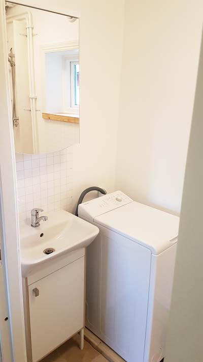 Then for the left side of the bathroom, I mounted a mirror cabinet and a small sink. I built a sturdy platform and installed my washing machine.