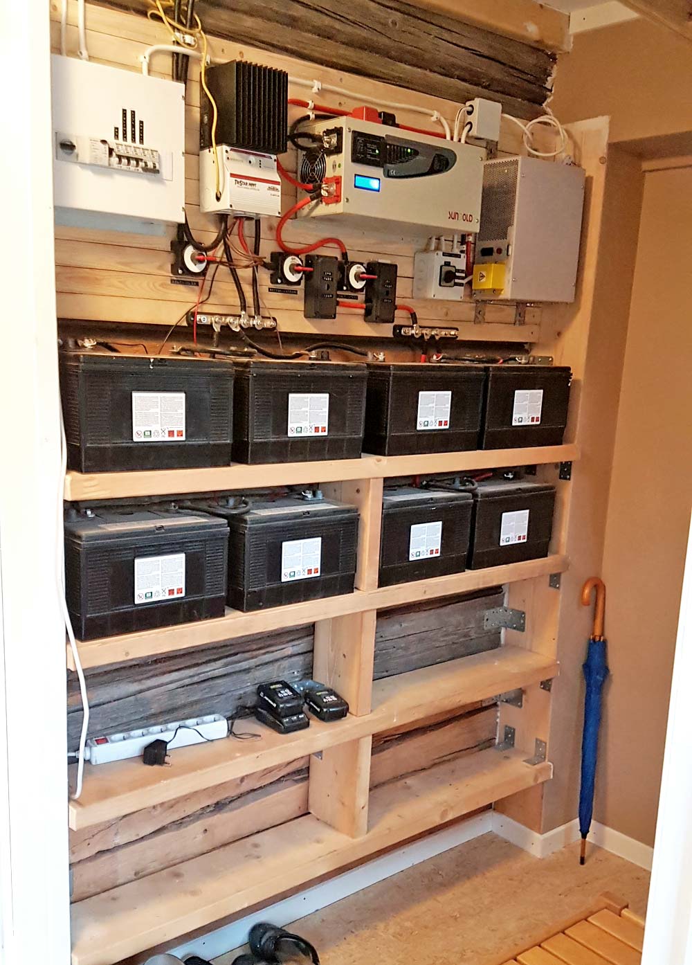 With such a nice new floor, it was time to clean up the electric hub. I made proper battery shelves, and mounted the equipment above them. From left to right in the picture: AC fuse box, solar power charge controller, 3 kW power inverter and 700 W power inverter. Below them are switches and DC fuses. The shelves are currently housing eight 12 V 100 Ah lead acid batteries, with space for 20 when it's time to expand.