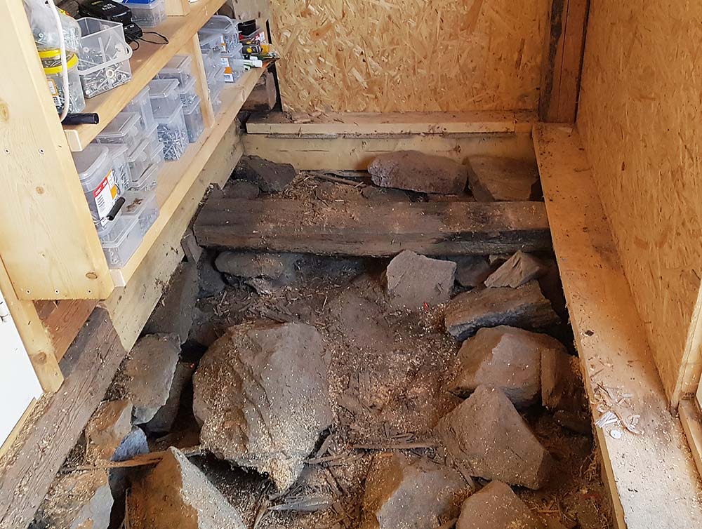 It was time to make a new floor for the entrance vestibule area. I took help from my father to remove the floor boards and old joists, which revealed the stone foundation.