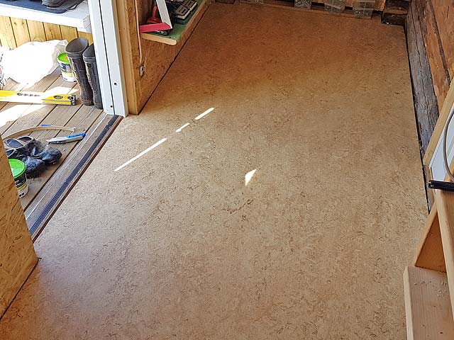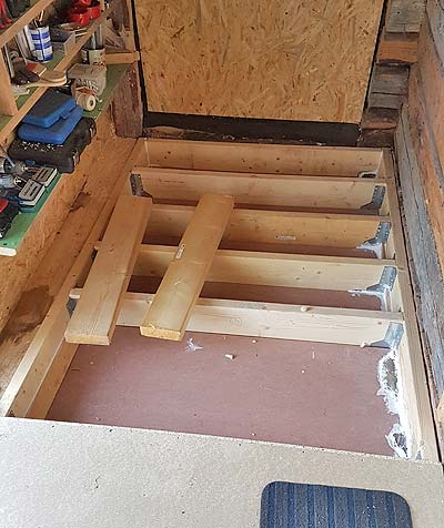 I filled up the space with mineral wool and screwed 22 mm (7/8") particle board to make the floor. Finally a tough sheet of linoleum was glued on top.
