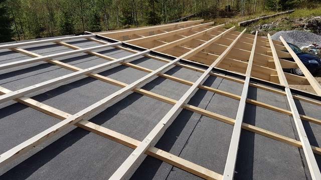 To make the workshop roof, I screwed tongue-groove boards to the rafters, covered it with tar paper, and then mounted a grid of battens that aligned with the 45 x 70 mm (2" x 3") purlins that covered the rest of the roof.