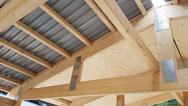 Detail of the ceiling, where you can see the truss, the purlins, the tongue-groove boards and the corrugated roof.