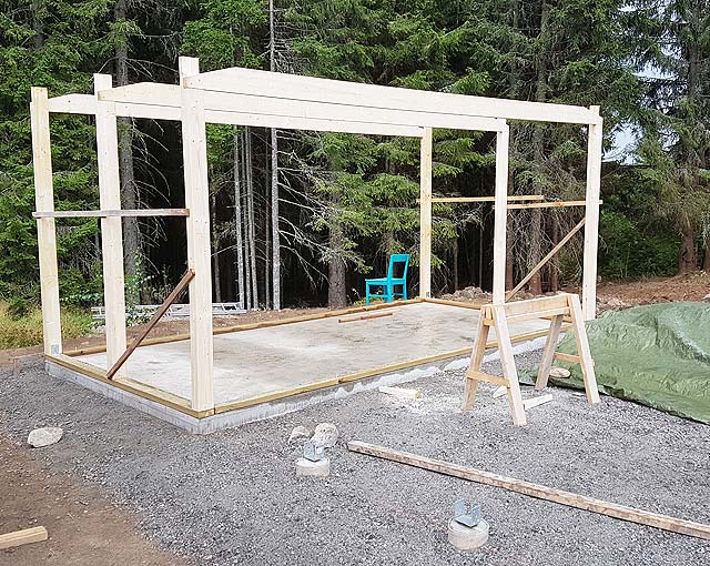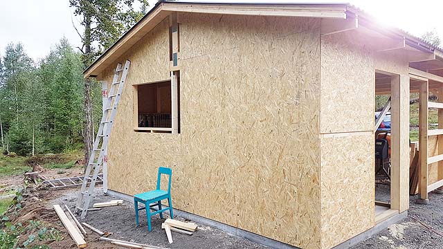 I erected the workshop wall frame from 45 x 95 mm (2" x 4") studs, and screwed 10 mm OSB board to it, and then stapled a weather membrane to the entire outside.