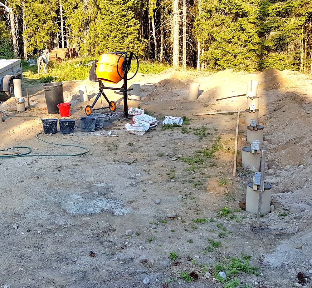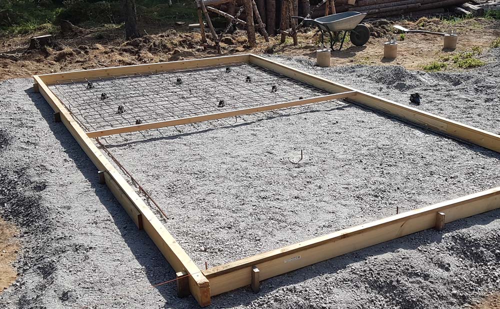 Next I compacted the ground, and made a form for the 110 mm thick concrete slab. I cast it in two sessions, each being a full day event. At the bottom I placed a 6 mm rebar grid for concrete tension support. This was the driest summer in a generation, so I had to ration all water to save enough to complete the slab, driving to a nearby lake to take baths.