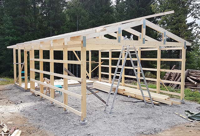 The garage is now 90% done. Needs gables, gutters, two garage doors and electric installations.