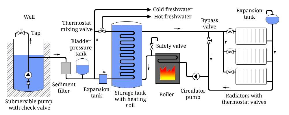 Schematic of the heating and fresh water system.