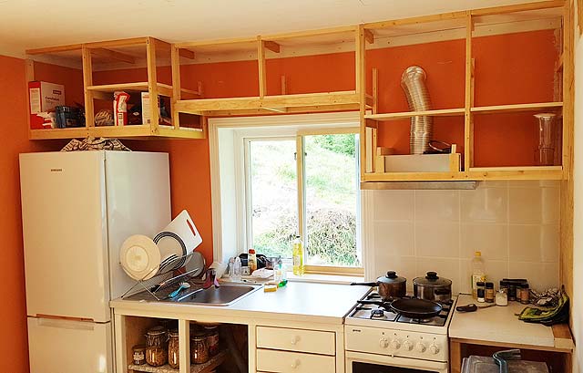 I built the frames and bottoms for the kitchen cabinets and installed the stove fan. Next step is to mount the doors. I also mounted ceramic wall tiles, and extended the counter top to the right side of the stove.