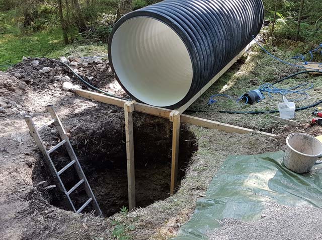 However, the big problem was the lining of the hole. Normally concrete rings are used, but this area was not accessible to heavy machines. I decided to use a polypropylene plastic road pipe, 1 m in diameter and 3 m long. I rigged up a mounting support of wood near the hole, then carefully moved the pipe there.