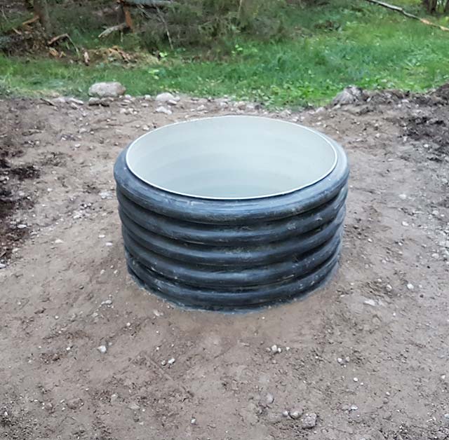 I filled the bottom with coarse sand, 30 cm thick. With the help of a winch, I slowly lowered the 150 kg pipe into the hole and luckily it fit perfectly, with the top 0.5 m above ground. I filled the void on the outside, first with coarse sand up to 1 m from ground level, then with the dug up gravel to create somewhat of a barrier against surface water.