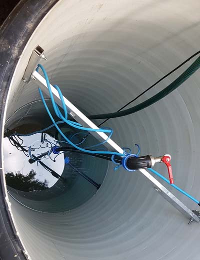 1.2 m below ground level, I drilled a hole in the side, and mounted a tight seal for a 32 mm PEM fresh water pipe. The pipe got connected to a deep well pump at the bottom, which was suspended by a rope from an aluminium bar mounted at the top of the well.