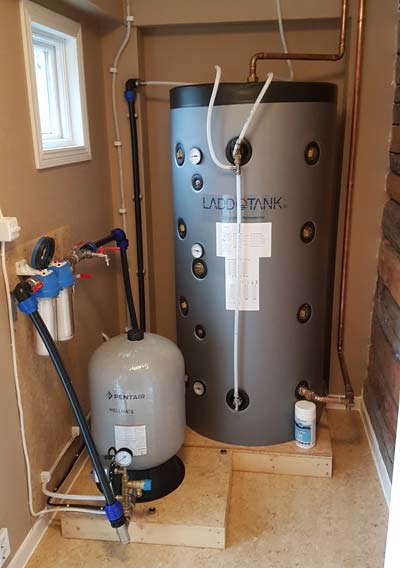 The fresh water pipe leads up into the house vestibule, where it passes through two sediment filters, and then into a bladder tank with a pressure switch that turns the well pump on and off.