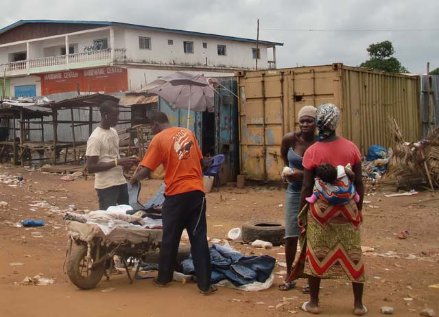 Below: Locals selling clothes at a roadside market, Monrovia.