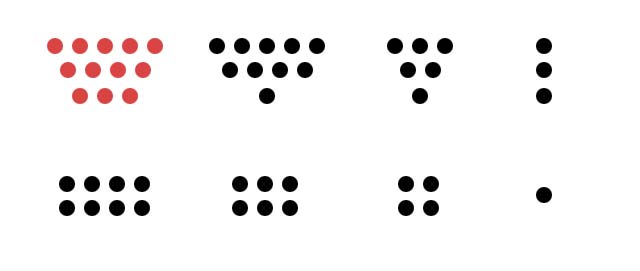 Below: The starting position of Nim in red. Many variations exist, this is just the one we used. The safe positions are in black. Notice that no matter what the opponent does at a black state, you can always pick markers to get to the next black state, so they are true stepping stones. For example at the 5-4-1 state, if the opponent takes two from the second row, then you take two from the first row, and you are at 3-2-1. Since the starting position is not a safe state, the player that starts will always win, if he knows this system.